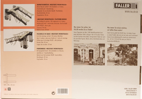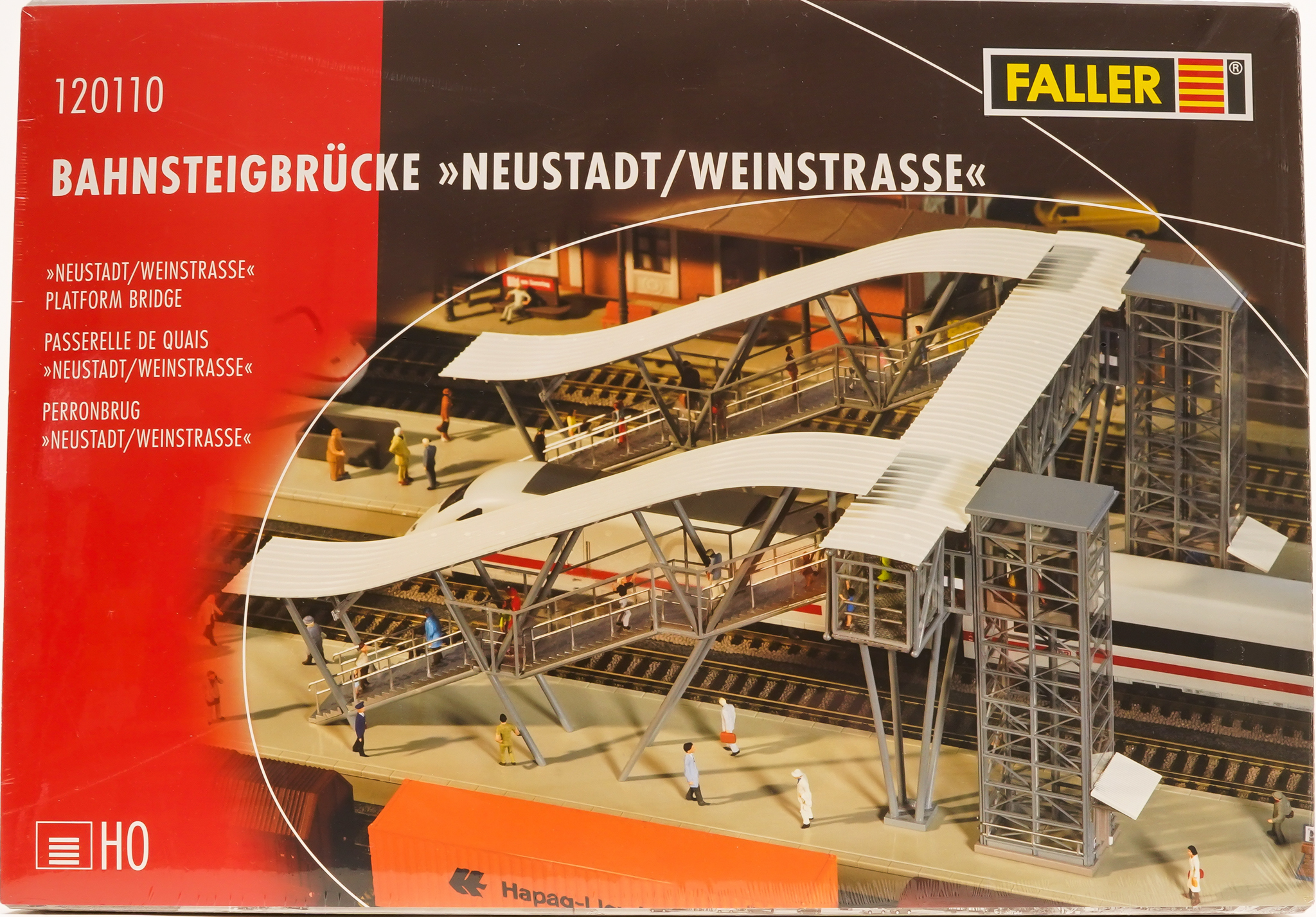 Originalnachbau der Bahnsteigbrücke in Neustadt, passend zum FALLER Bahnhof »Neustadt/Weinstraße« 110111. Moderne Glas-/ Stahlkonstruktion, mit zwei überdachten Treppen-Auf-/ Abgängen, 2 Gleise überspannendem Brückenteil und 2 angebauten Aufzugstürmen (ohne Funktion).