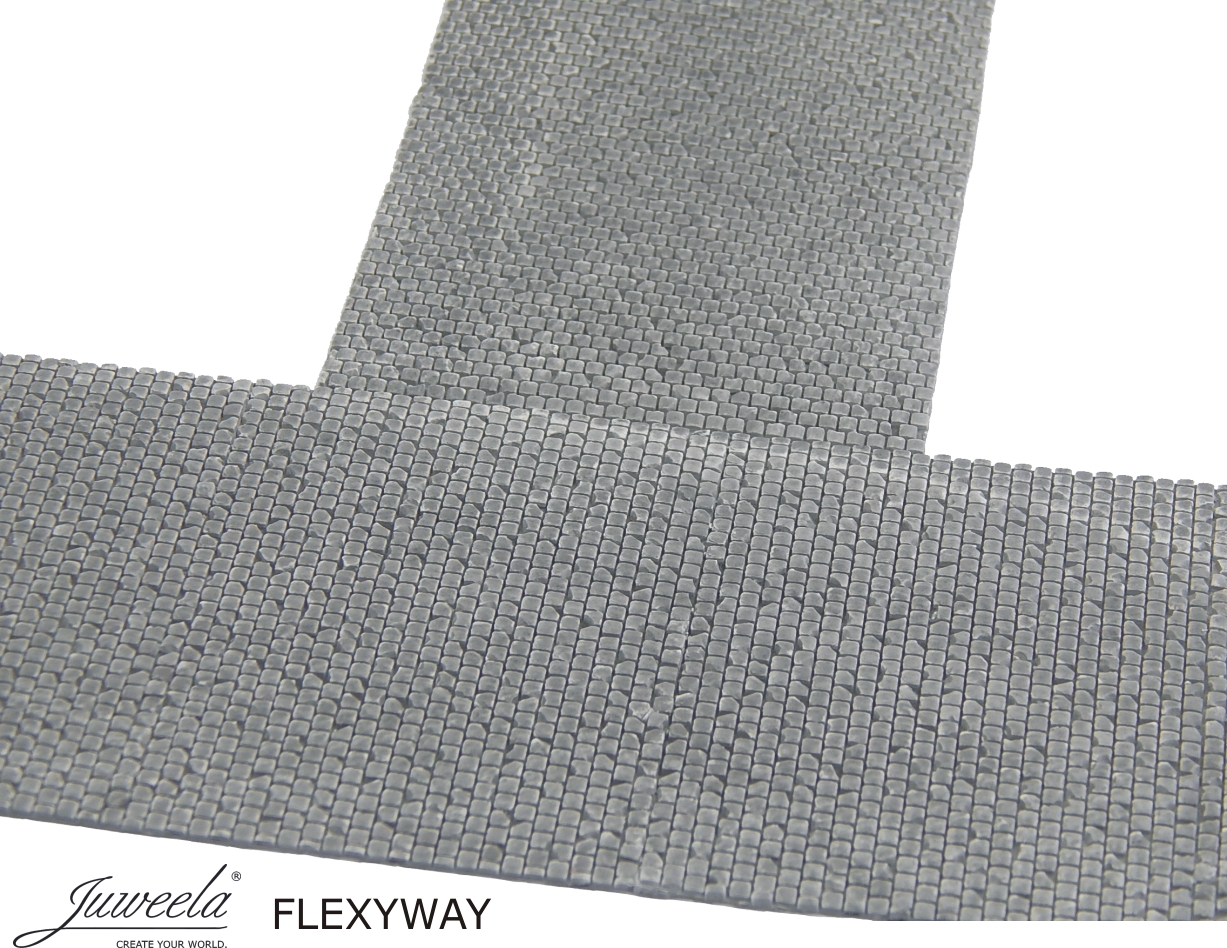 Flexyway sind feste Juweela Steine, die einzeln auf einer dünnen Trägerfolie sitzen. Das macht das komplette Segment in-sich-selbst-flexibel. Jeder Stein kann einzeln entnommen werden: Schlaglöcher, Schäden, Krater oder die Baustelle können also da sein wo gewünscht.