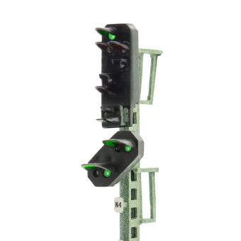 -Bauteile unlackiert; Farbgebung realistisch mit grauem Mast. Zur optimalen Farbgebung empfehlen wir unseren Lack DB 601 Bronzegrün für lackierte Signalmasten (Gestaltungsbeispiel siehe Fotos)
