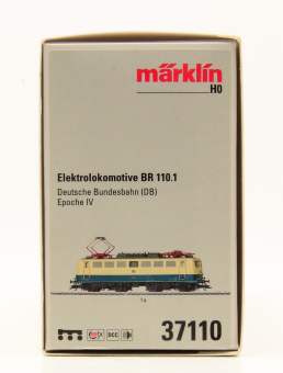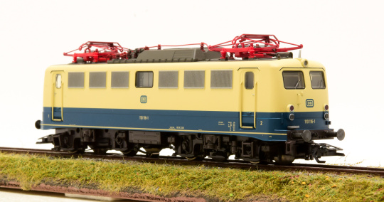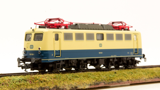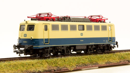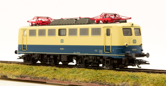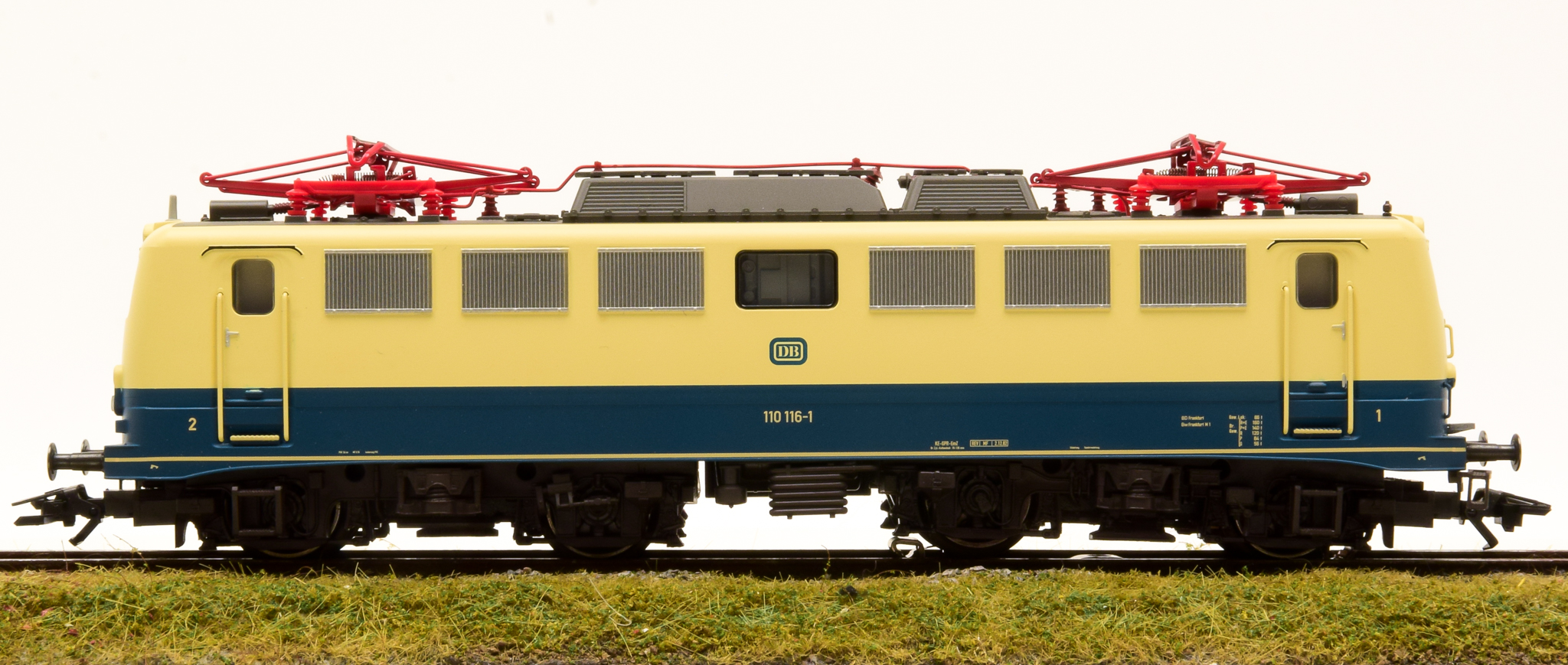 Elektrolok Baureihe 110.1 der Deutschen Bundesbahn (DB). Mit drei Lampen am Lokende 1 und fünf Lampen am Lokende 2. Mit „Klatte“-Lüftergitter und einteilige, abgerundete Maschinenraumfenster. Ohne umlaufende Regenrinne. Ohne Schürzen und Pufferverkleidungen. Farbgebung in Ozeanblau/Elfenbein.