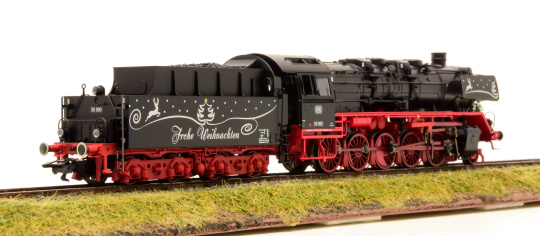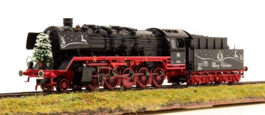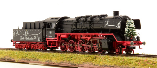 Eine tolle Geschenkidee zu Weihnachten: In den 1950er- und 1960er-Jahren empfingen zu Weihnachten oder Ostern oftmals mit entsprechenden Aufschriften versehene Dampfloks ihre Fahrgäste am Bahnhof. Nun gibt es die Weihnachtsgrüße auch als edle Modelldampflok in glasklarer Acryl-Vitrine. Einen besonderen Blickfang bietet die 50 980 mit ihren Weihnachtsgrüßen und dem beleuchteten Tannenbaum auf der Pufferbohle. Als besonders Highlight pfeift die Lok auch noch „O Tannenbaum, ...“.