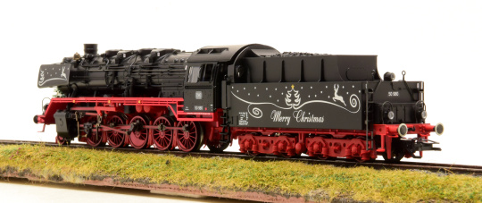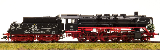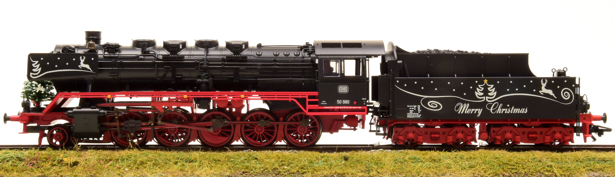 Vorbild: Güterzug-Dampflok Baureihe 50 der Deutschen Bundesbahn (DB), mit Kohlen-Schlepptender als Einheits-Kastentender 2´2´T26 in der Ursprungsform. Mit Witte-Windleitblechen, Regelführerhaus, langem Umlauf vorne zur Rauchkammer schräg abfallend, DB-Reflexglaslampen und einseitigem Indusi. Betriebszustand um 1960. Ein Einsatz dieser Lokomotive mit Weihnachtsbaum und weihnachtlicher Gestaltung ist nicht verbrieft.