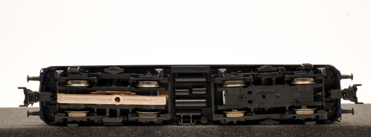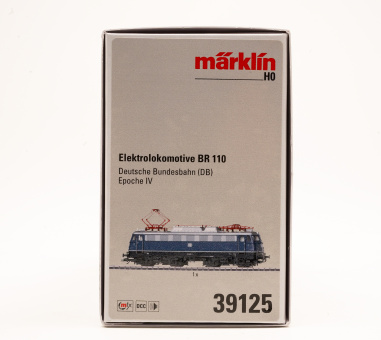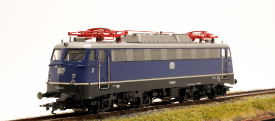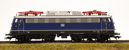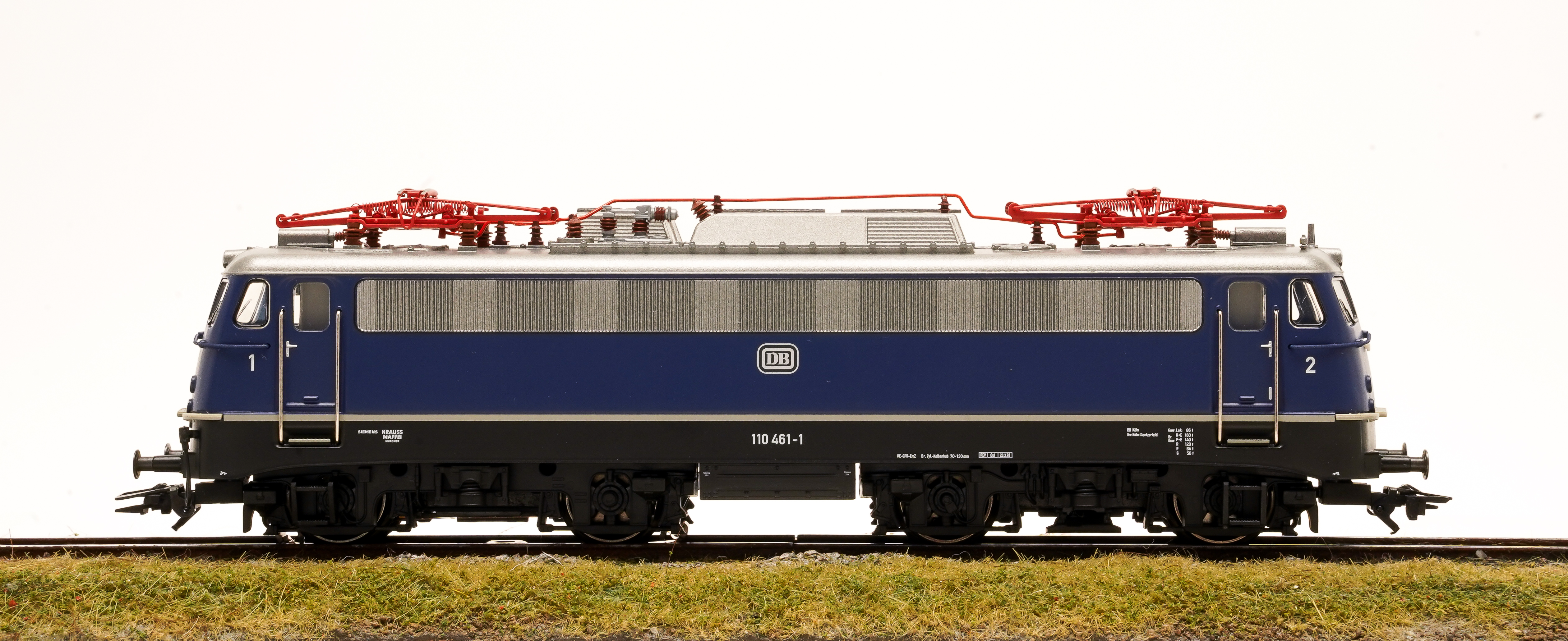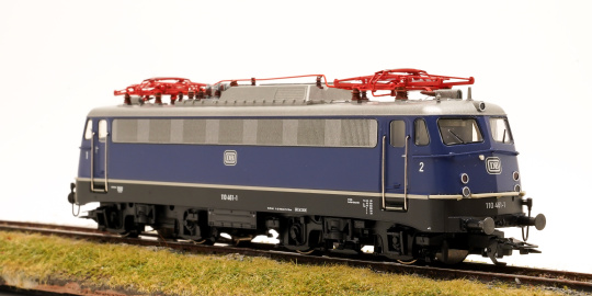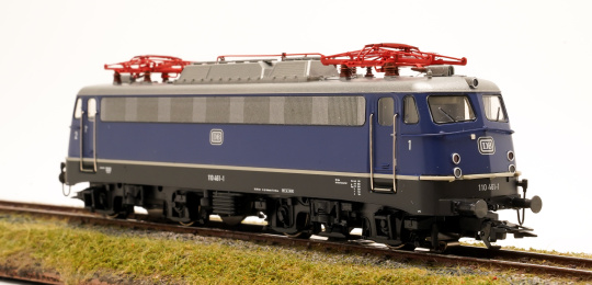 Vorbild: Elektrolokomotive Baureihe 110 der Deutschen Bundesbahn (DB). Lokkasten mit aerodynamischer Front, der sogenannten Bügelfalte, mit durchgehendem Lüfterband, umlaufender Regenrinne und stirnseitigen Griffstangen. Kobaltblaue Grundfarbgebung.