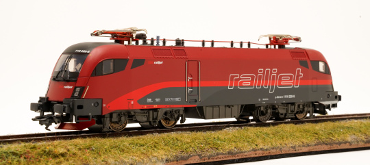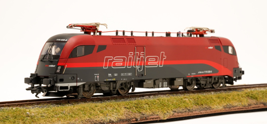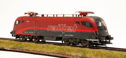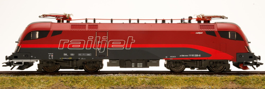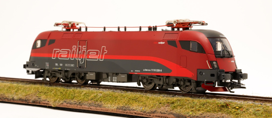 Vorbild: Elektrolok Reihe 1116 "Taurus" der Österreichischen Bundesbahn (ÖBB), in braunrot/verkehrsroter railjet-Gestaltung. Lok-Betriebsnummer 1116 228-8. Aktueller Betriebszustand.