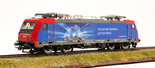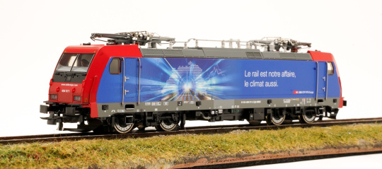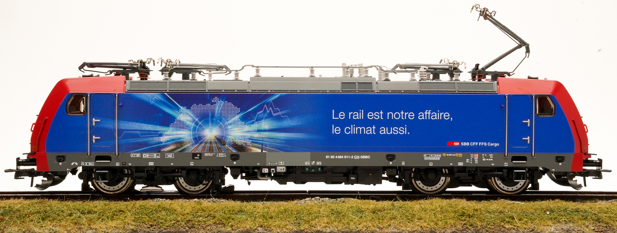 Mit dem Statement „Gut auf der Schiene – gut fürs Klima‟ rollte die Re 484 011 im Oktober 2021 aus der Werkstatt. Die Botschaft ist auf der gegenüberliegenden Seite in französischer Sprache angebracht. Die Abbildung symbolisiert, mit der Schweizer Karte und den mitten hindurch fahrenden Schienengüterverkehr, den stark steigenden Transport durch die Schweiz.