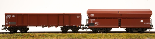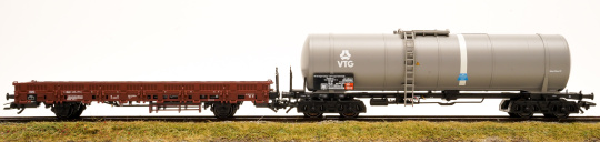 Vorbild: Elektrolokomotive Baureihe 140 der Deutschen Bundesbahn (DB), 1 offener Güterwagen Eaos 106, 1 offener Selbstentladewagen Fad 167, 1 Rungenwagen Kbs 443 der Deutschen Bundesbahn (DB) und 1 Mineralölkesselwagen der VTG GmbH, eingestellt bei der Deutschen Bundesbahn (DB). Betriebszustand um 1979.