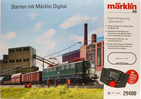 Inhalt: 12 gebogene Gleise 24130, 5 gerade Gleise 24188, 7 gerade Gleise 24172, 2 gebogene Gleise 24224 und 1 Paar Weichen 24611 und 24612. Gleisanschlussbox, Schaltnetzteil 230 V/36 VA und Mobile Station 2 mit neustem Update 5.3 und Anleitung