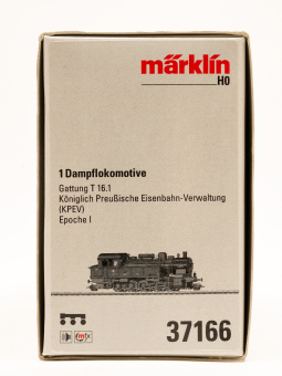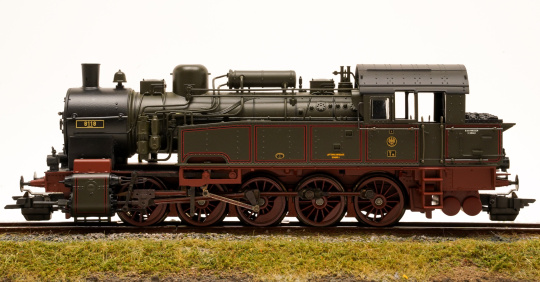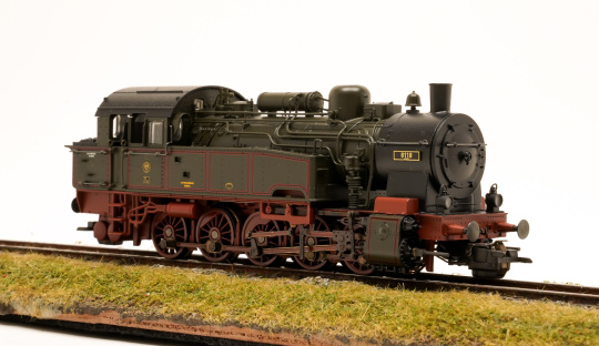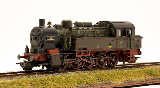 Tender-Dampflok T16 der KPEV in braungrüne Grundfarbgebung, mit Läutewerk und Vorwärmer auf dem Kesselscheitel sowie Stangenpuffer