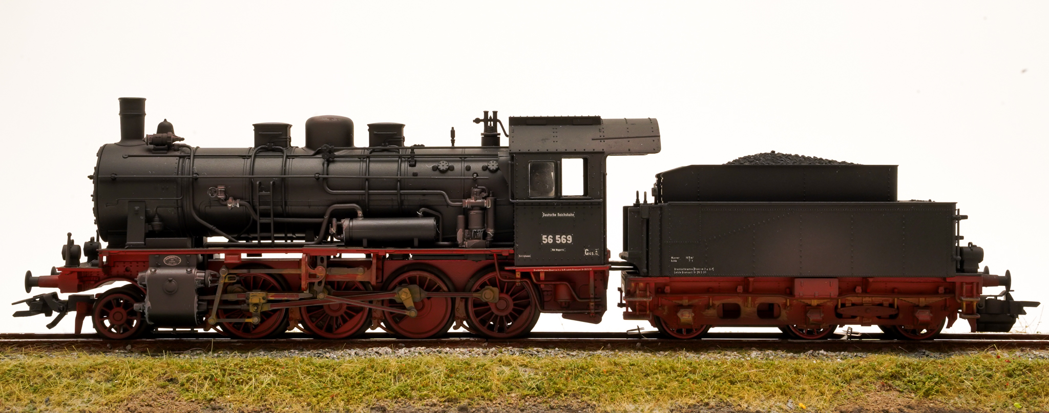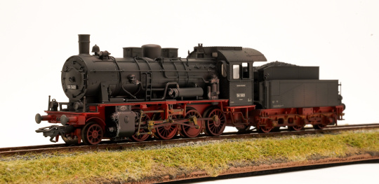 Umgebaute preußische G 8.1 mit Laufachse. Mit Reichsbahn-Laternen und Läutewerk. Kohlen-Schlepptender der Bauart 3T 16,5