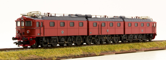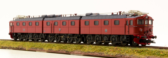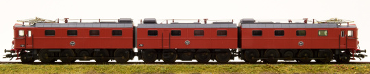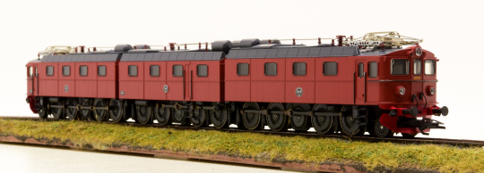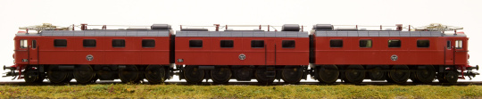Schwere Erzlokomotive als 3-tlg. Stangen-Elektrolok Reihe Dm3 der Schwedischen Staatsbahnen (SJ). Eingesetzt auf der Erzbahn Lulea - Kiruna - Narvik. Serie 1200, mit den Betriebsnummern 1201+1231+1202. Braune Grundfarbgebung, große Stirnlampen, Führerstandstüren in alter Anordnung, große Schneepflüge (Norrlandspflüge) und SAB-Gummifederräder. Betriebszustand um 1970.