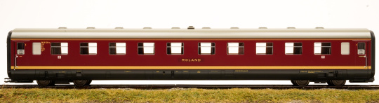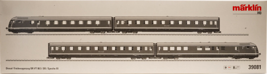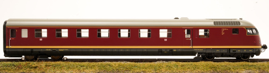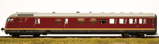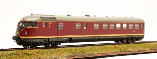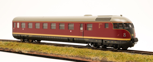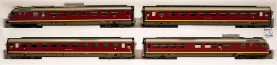 Diesel-Triebwagenzug Baureihe VT 08.5 der Deutschen Bundesbahn (DB), als FT 43 "Roland" mit dem Zuglauf Basel SBB - Bremen. 4-tlg. Garnitur in purpurroter Farbgebung. 1 Triebwagen VT 08.5 mit Küche und Speiseraum (WRPwPost4üm), 2 Mittelwagen VM 08.5 mit Abteilen (A4üm), 1 Triebwagen VT 08.5 mit Abteilen (A4üm). Betriebszustand um 1959.