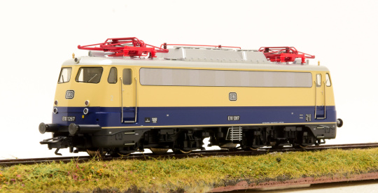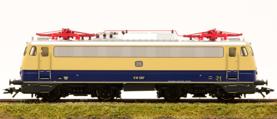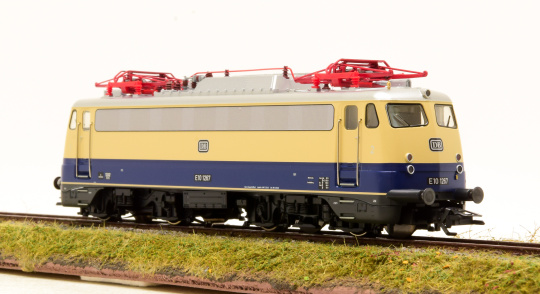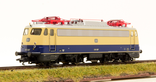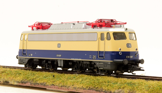 Elektrolokomotive Baureihe E 10.12 der Deutschen Bundesbahn (DB). Schnellfahrlokomotive mit aerodynamischer Front (Bügelfalte), Hochleistungs-Drehgestellen und Frontschürze. Farbgebung in kobaltblau/beige als Zuglokomotive für den legendären Rheinpfeil.
