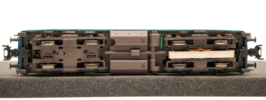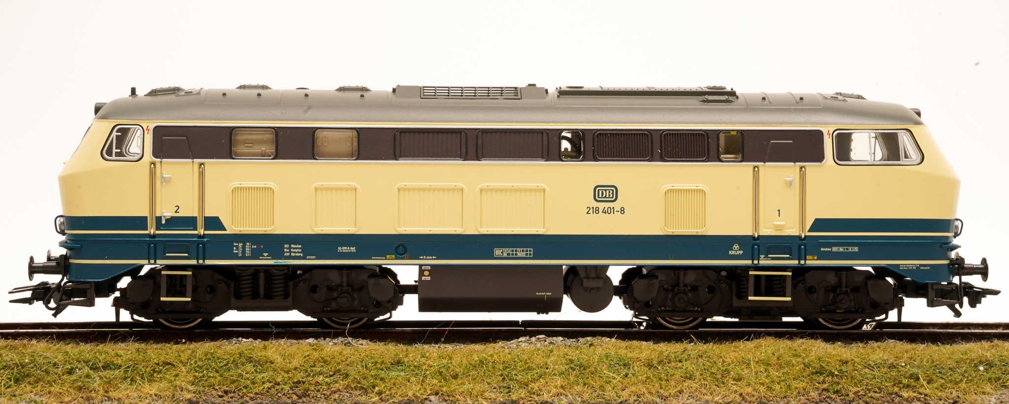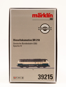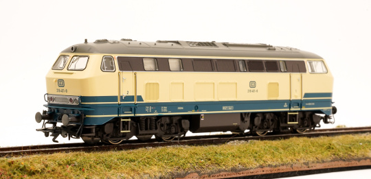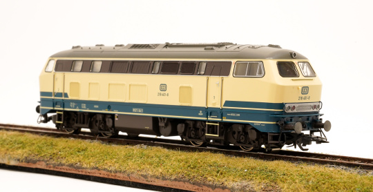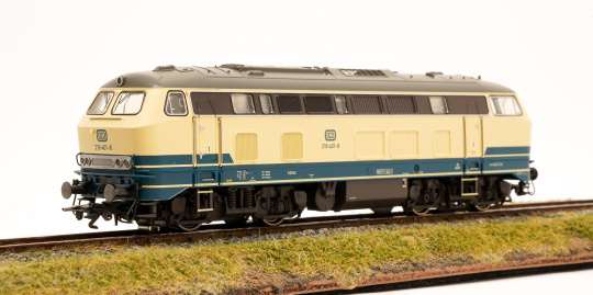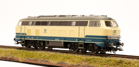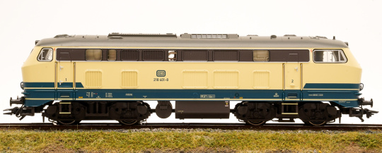 Vorbild: Diesellok Baureihe 218 der Deutschen Bundesbahn (DB). Ozeanblau/Elfenbeinfarbene Grundfarbgebung. Betriebszustand ab 1976.