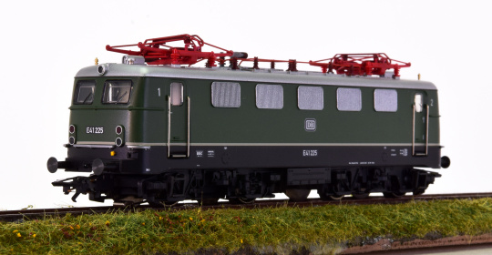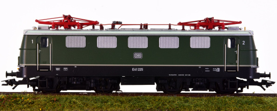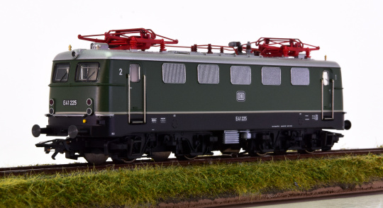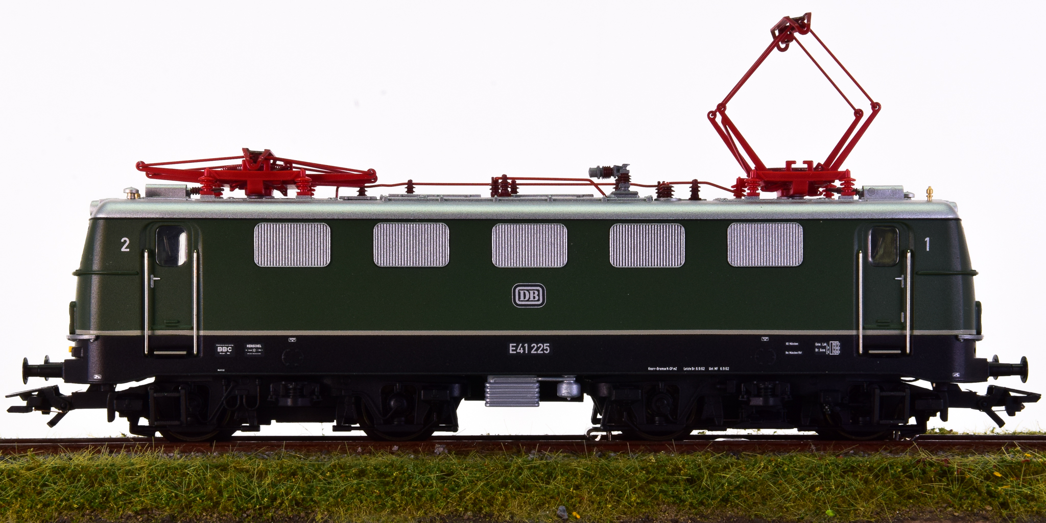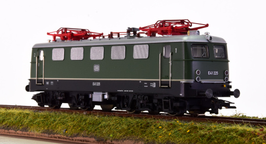 Baureihe E 41 der Deutschen Bundesbahn (DB). Mit 5 Lampen, abgerundeten Lüftern, senkrechten Lamellen und umlaufender Regenrinne. Farbgebung chromoxidgrün.