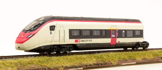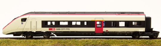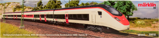 Vorbild: Elektrischer Hochgeschwindigkeits-Triebzug EC 250 als RABe 501 "Giruno" der Schweizerischen Bundesbahnen (SBB). 1 Endwagen A (Bt1), 2. Klasse. 1 Mittelwagen F (B7), 2. Klasse, mit behindertengerechten Einstiegen und Pantograph. 1 Mittelwagen G (WR6), mit Restaurant-Bereich. 1 Mittelwagen H (A5), 1. Klasse, mit Behinderten-Einstiegen und Pantograph. 1 Endwagen L (At2), 1. Klasse. Als Mehrsystem-Triebzug im Einsatz zwischen Zürich Flughafen und Basel sowie alpenquerend durch den Gotthard-Basistunnel bis Mailand. Mit Zulassung auch nach Deutschland und Österreich vorgesehen. Zug-Nummer RABe 501 003, mit Wappen "San Gottardo". Aktueller Betriebszustand 2022.