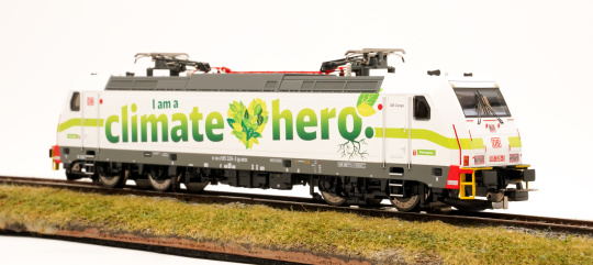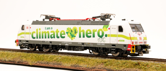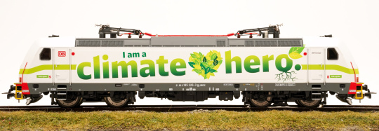 Auf der Homepage der DB-Cargo findet man dazu dieses Zitat: "Wir sind Klimahelden, weil der Schienengüterverkehr im Vergleich zum Lkw ungefähr 80 Prozent weniger CO 2 Emissionen versursacht und das umweltfreundlichste Transportmittel ist. Diesen Titel hat sich unsere Lok verdient."