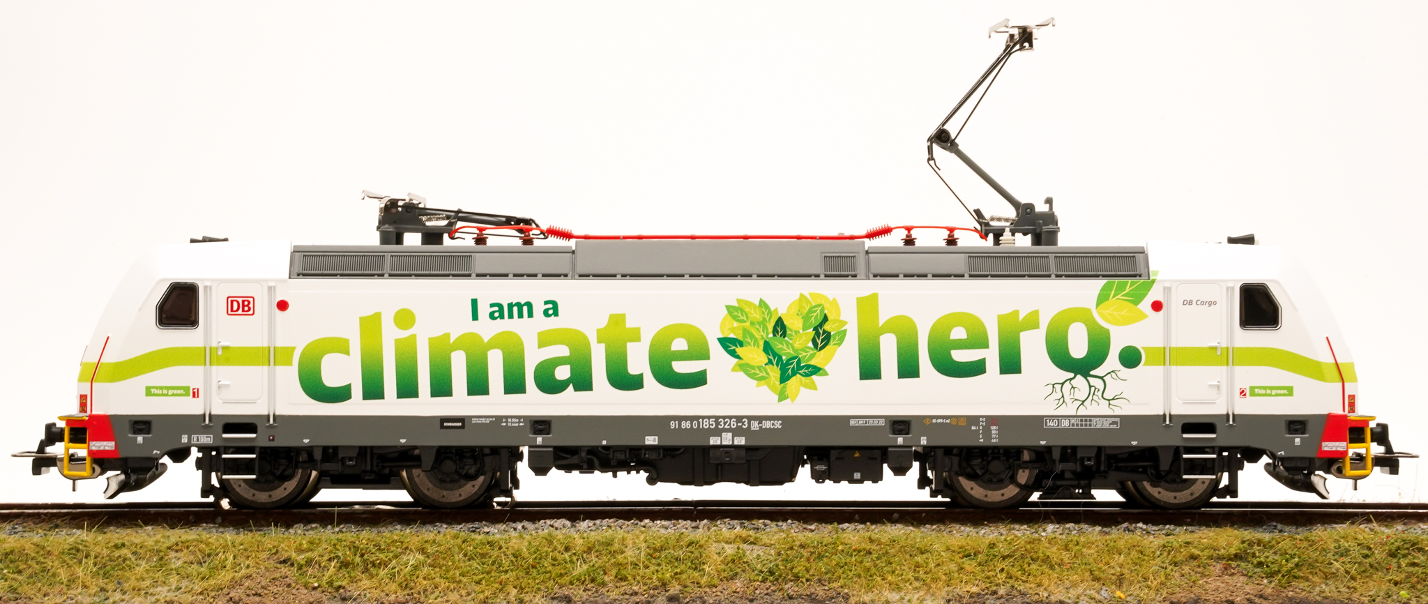 DB-Cargo setzt auf Klimaschutz und das wird auch mit Lokomotiven zum Ausdruck gebracht. Viele Lokomotiven werden als Werbeträger für solche Kernbotschaften genutzt, so auch die 185 326-3 mit der Aufschrift "I am a climate hero".