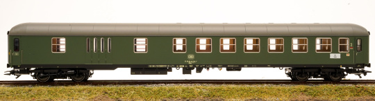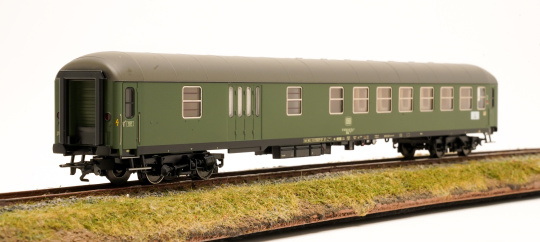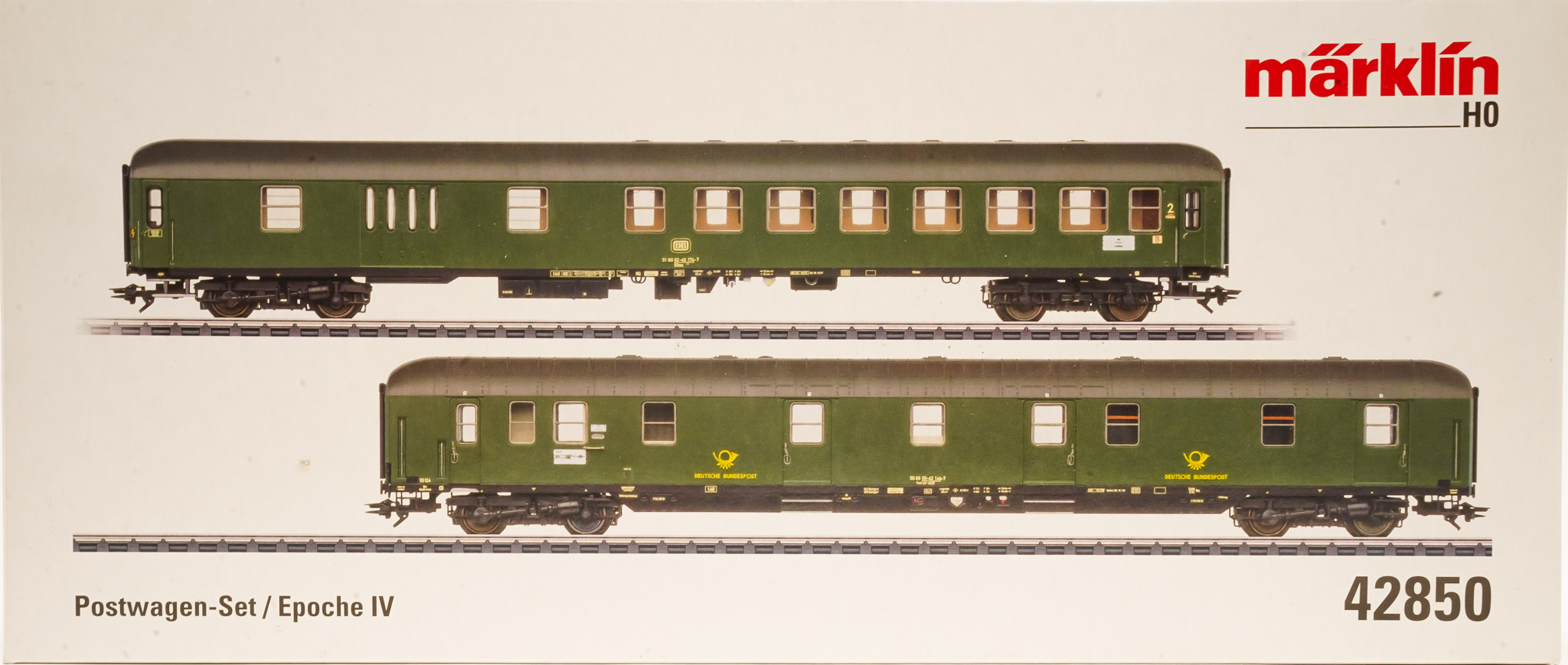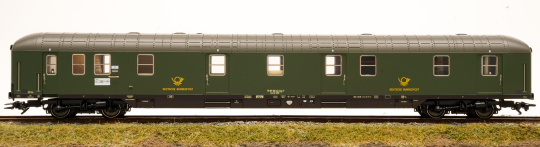 Vorbild: Ein Bahnpostwagen Bauart Post mr-a der Deutschen Bundespost (DBP), eingestellt bei der Deutschen Bundesbahn (DB) und ein Halbgepäckwagen Bauart BDüms 273 2. Klasse der Deutschen Bundesbahn (DB). Ausführung des Bahnpostwagens als Allespostwagen mit Abzugshaube für Kohleofen, seitlichen Luftansauglamellen und Luft-Umschalteinrichtung. Wagenlauf des Bahnpostwagens: Ulm – Friedrichshafen/Ravensburg. Wagenlauf des Halbgepäckwagens: Ulm – Lindau. Wagen-Ordnungsnummer 20. Chromoxidgrüne Farbgebung. Betriebszustand um 1978.