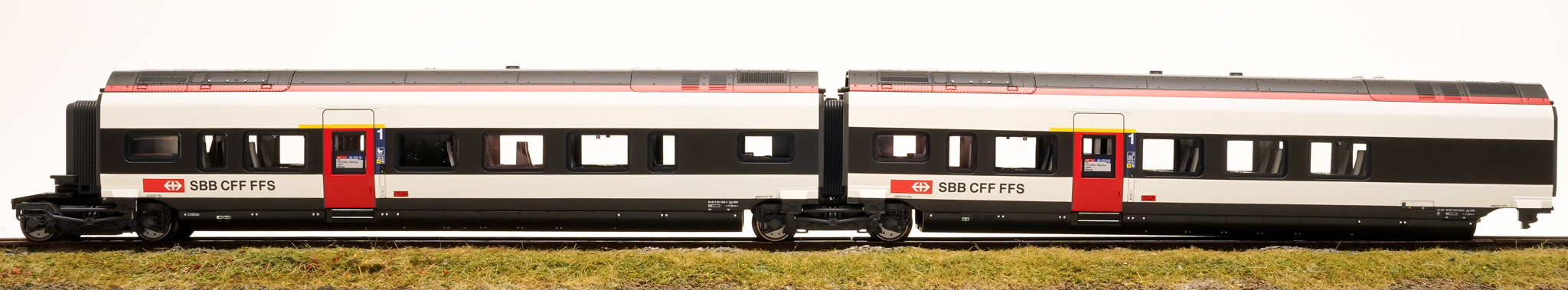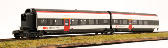 Vorbild: Ergänzungswagen für den Hochgeschwindigkeits-Triebzug RABe 501 "Giruno" der Schweizerischen Bundesbahnen (SBB). 1 Mittelwagen J (A4), 1. Klasse. 1 Mittelwagen K (A3), 1. Klasse. Passend zur Zug-Nummer RABe 501 003 "San Gottardo". Aktueller Betriebszustand 2022.