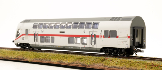 Vorbild: IC2 Doppelstock-Steuerwagen DBpbzfa 668.2, 2. Klasse, der Deutschen Bahn AG (DB AG) für den Fernverkehr. Lichtgraue Fernverkehrs-Farbgebung mit verkehrsrotem Zierstreifen, im aktuellen IC-Design. Zuglauf: IC 2045 von Köln nach Dresden Hbf. Wagen-Ordnungsnummer 1. Betriebszustand 2020.