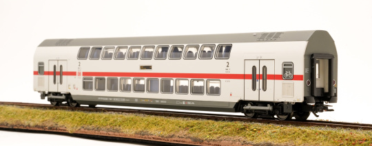 Vorbild: IC2 Doppelstock-Mittelwagen DBpza 682.2, 2. Klasse, der Deutschen Bahn AG (DB AG) für den Fernverkehr. Lichtgraue Fernverkehrs-Farbgebung mit verkehrsrotem Zierstreifen, im aktuellen IC-Design. Zuglauf: IC 2045 von Köln nach Dresden Hbf. Wagen-Ordnungsnummer 4. Betriebszustand 2020.