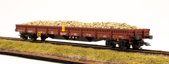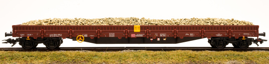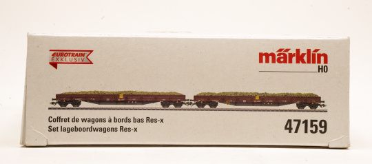 Set bestehend aus zwei vierachsigen Niederbordwagen Bauart Res-x der Deutschen Bahn AG (DB AG). Europäische Standardbauart mit 19,90 m Länge. Rotbraune Grundfarbgebung. Betriebszustand ab 2020.