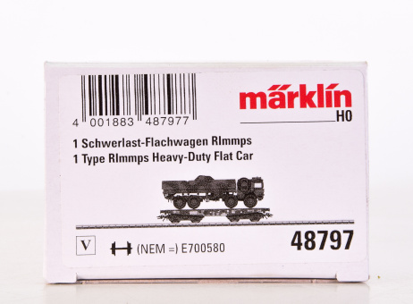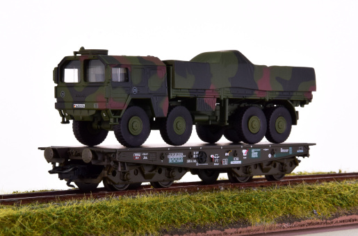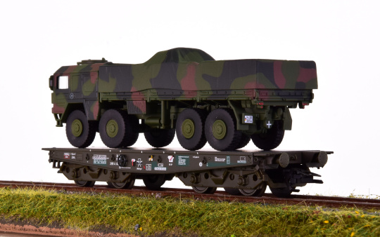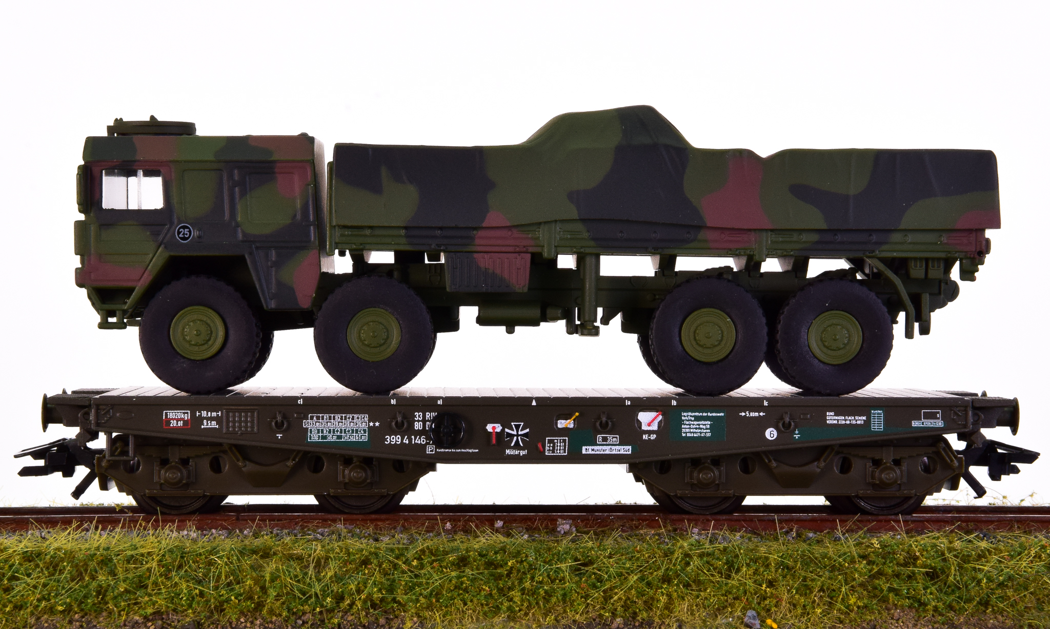 Märklin 48797 – Schwerlast-Flachwagen Rlmmps der Bundeswehr, mit MAN LKW 10t GL
