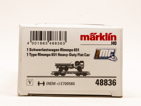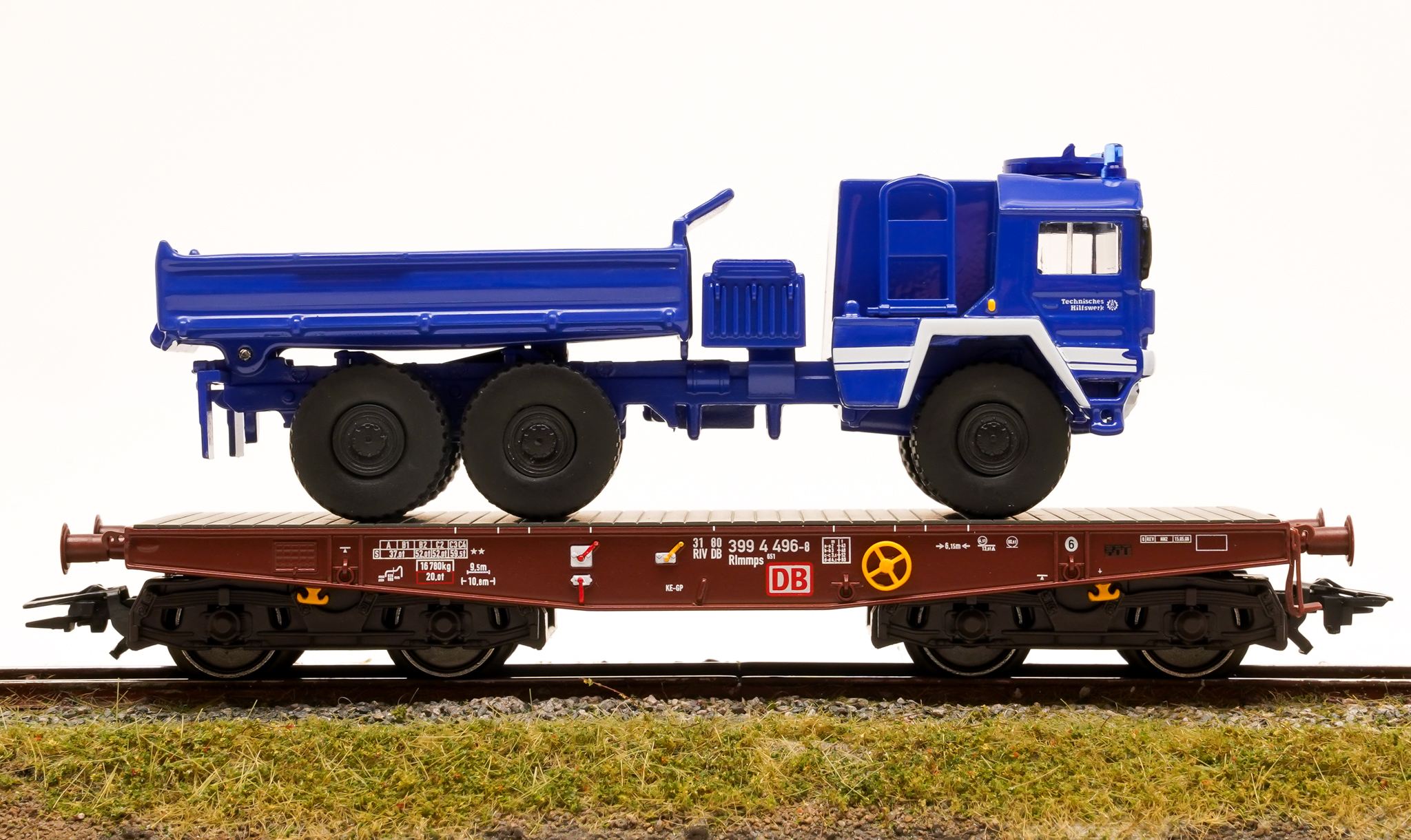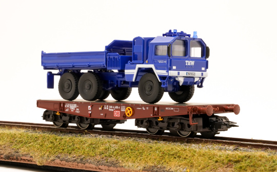 Märklin 48836 – Schwerlast-Flachwagen Rlmmps 650 der DB, mit MAN 3-Achser THW Kipper