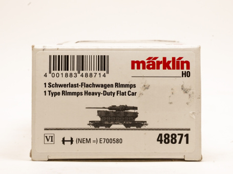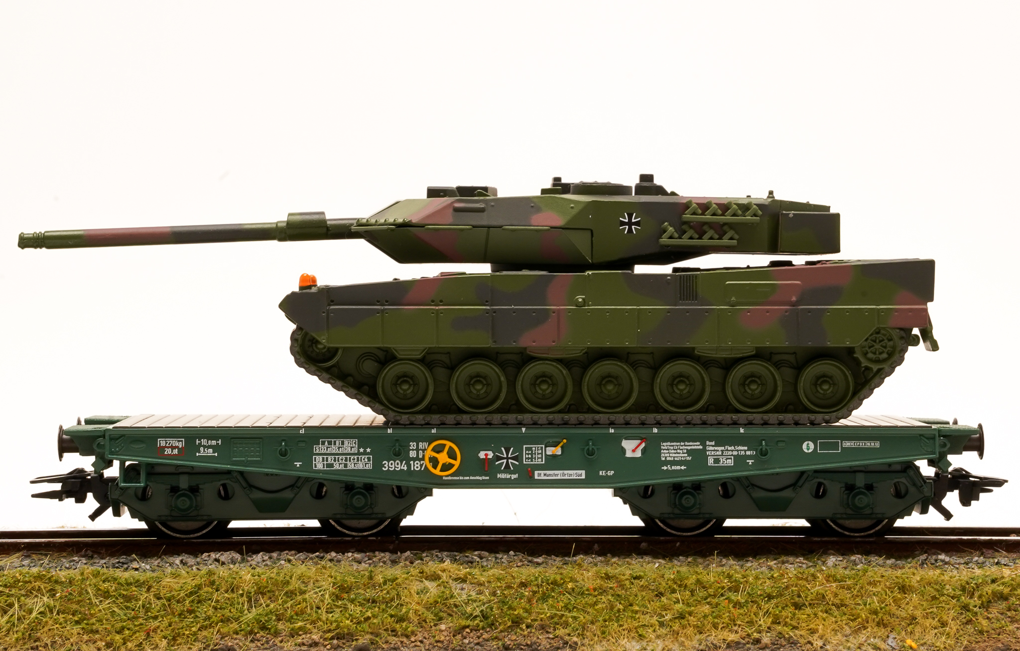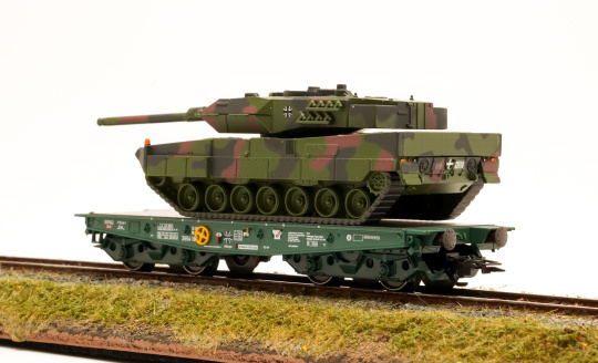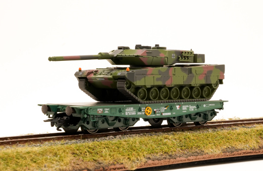 Schwerlast-Flachwagen Rlmmps der Bundeswehr beladen mit einem Kampfpanzer Leopard 2A6 der Deutschen Bundeswehr, eingestellt bei der Deutschen Bahn AG (DB AG).