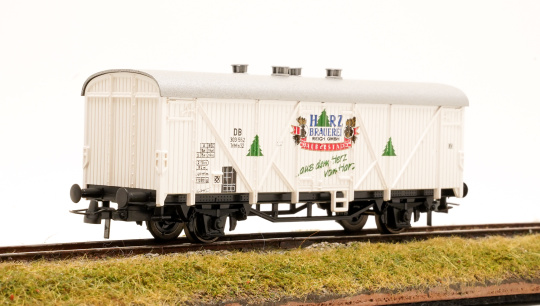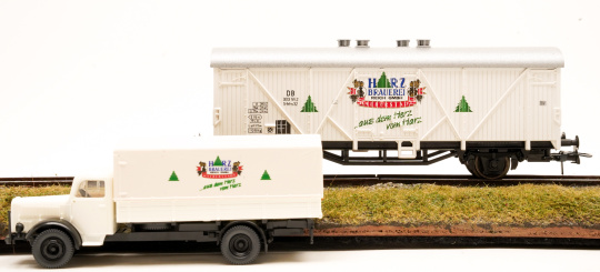 Roco 44102 – Bierwagen Tnfhs 32 -Harz Brauerei- der DB, mit Mercedes-Benz LKW