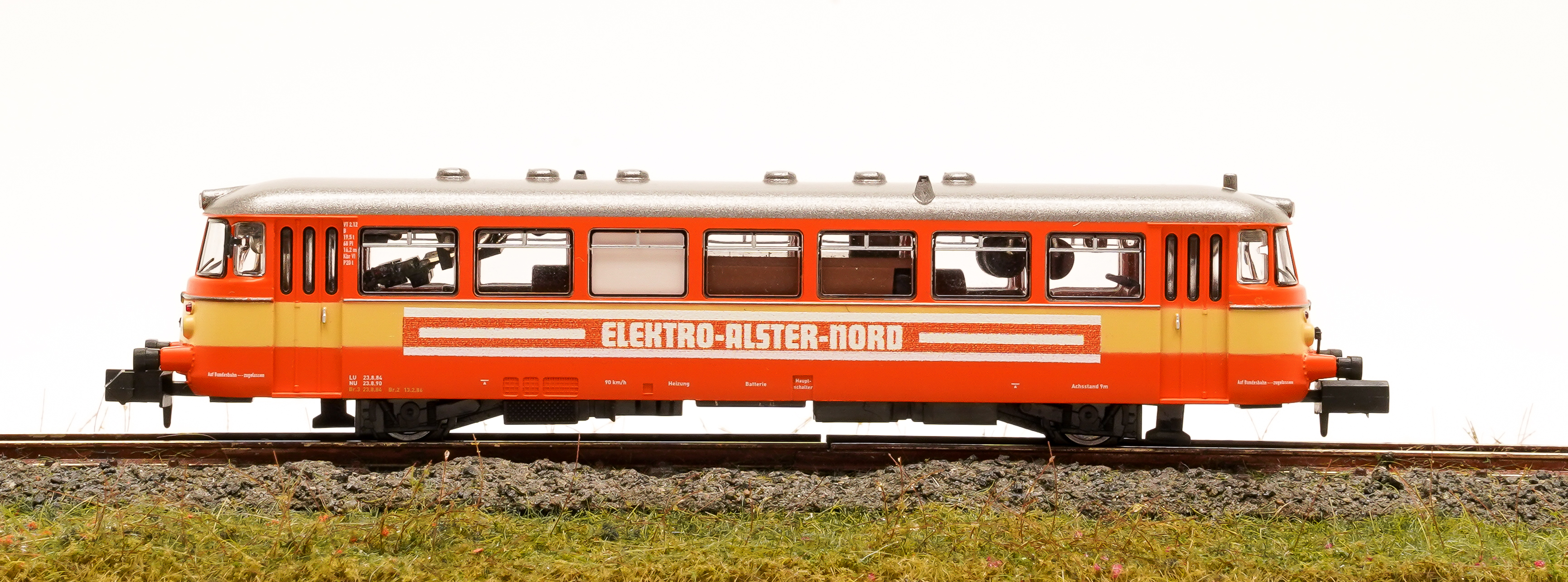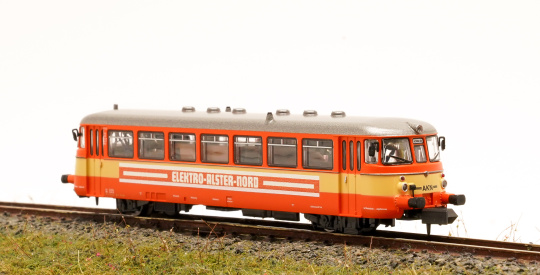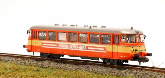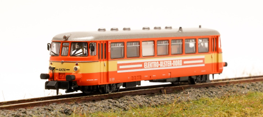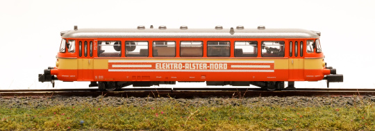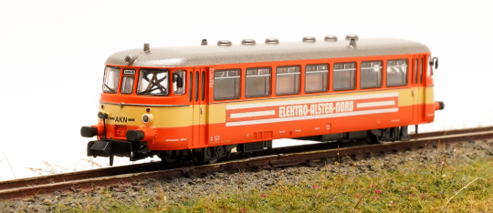 MAN Schienenbus VT2.12 der Altona-Kaltenkirchen-Neumünster Eisenbahn AG ( AKN ), mit Werbung Elektro Alster Nord.