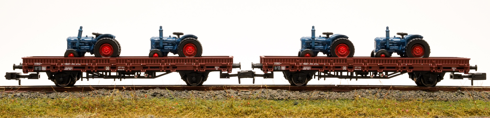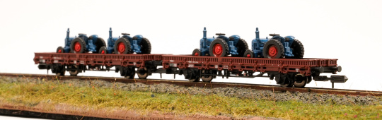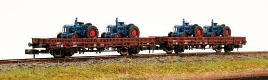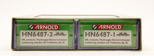Arnold HN6487 – 2-teiliges Flachwagenwagen-Set Rmmso 58 der DB,beladen mit Traktoren