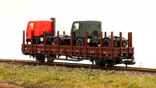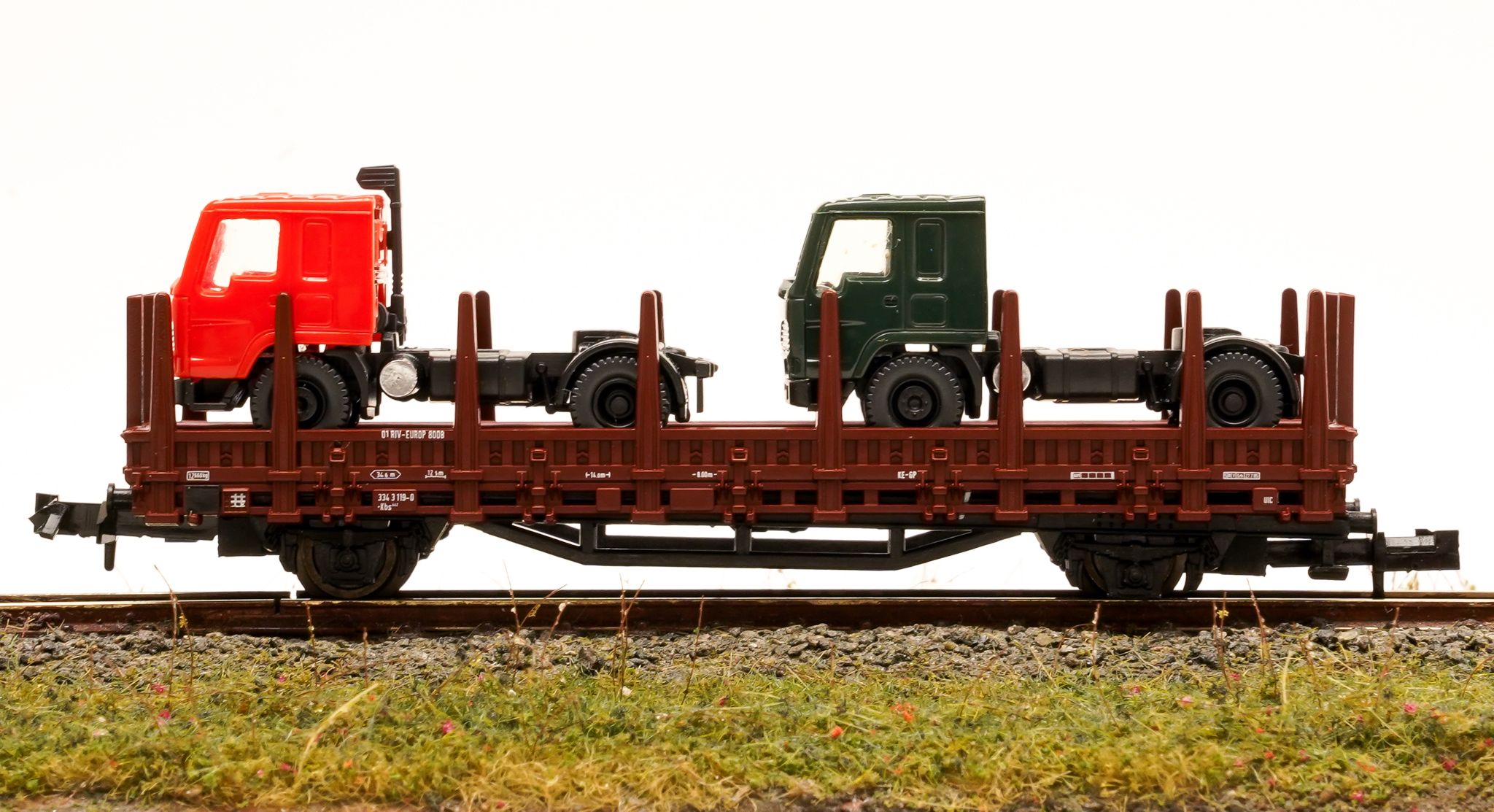 Roco 1906 (N) – Rungenwagen der DB, bel. mit zwei Volvo FL-Sattelzugmaschinen