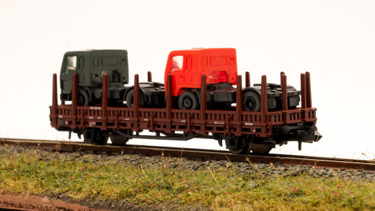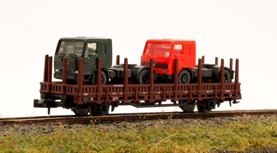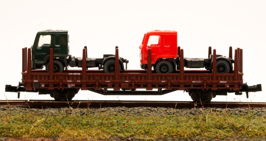 Roco 1906 (N) – Rungenwagen der DB, bel. mit zwei Volvo FL-Sattelzugmaschinen