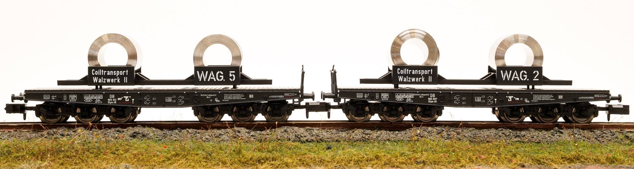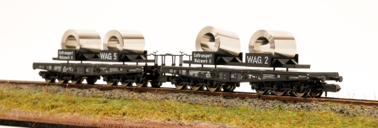 Minitrix 15182 – 2-teiliges Schwerlastwagen-Set Ssym 46 der DB, mit Coils beladen